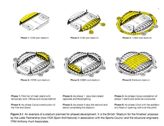 The image below taken from Stadia - A Design and Development Guide shows an example of staged development of a stadium from 3,000 to 20,000 capacity. http://www.scribd.com/doc/13320073/Stadia-A-Design-and-Development-Guide