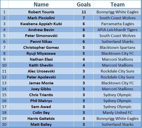 Can anybody write up a top 5 goalscorers list or something? NSW PL Website is next to useless, as per normal.