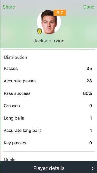 So Jedi may have won a lot of duels and clearances in the derby, but my god look at his passing accuracy...38% !!!  Meanwhile take a look at Jackson Irvine's passing accuracy from Burton's 2-0 loss to Leeds on the weekend:  I will accept that, while i was only able to watch the 1st half, it was primarily a hoof and hope game, but for me comparing the stats of the two highlights exactly why Jedi can be detrimental to the Socceroos and Ange's game plan, and why Irvine deserves a start for the Roos in the very, very near future.