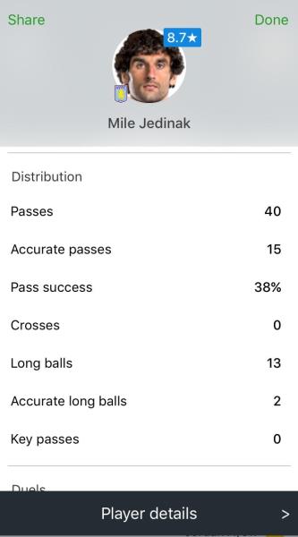 I am not surprised with the 11 aerial duels. Being a Villan I thought a local derby game would be a good match to watch ... but alas both teams were happy lobbing the ball in long from their own half (not far off being a volleyball match). Jedinak's main play was sitting deep in the midfield and kicking any balls that came his way as far up the field as possible (the opposition would then return serve ... it would bounce around a bit then hit back over the net, I mean half way line). I can't see Jedinak keeping his starting spot in the Socceroos given the style of play Villa do ... unless we need a game to sit deep and defend (given Ange's "winning" mentality" I see him becoming a bench player to add steel to the defense when we are up or holding on to a game, unless of course Villa change course and learn to pass the ball to players.