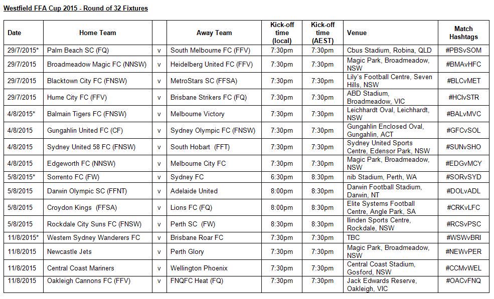 Quote:29/7/2015* Palm Beach SC (FQ) v South Melbourne FC (FFV) 7:30pm 7:30pm Cbus Stadium, Robina, QLD #PBSvSOM 29/7/2015 Broadmeadow Magic FC (NNSW) v Heidelberg United FC (FFV) 7:30pm 7:30pm Magic Park, Broadmeadow, NSW #BMAvHFC 29/7/2015 Blacktown City FC (FNSW) v MetroStars SC (FFSA) 7:30pm 7:30pm Lily’s Football Centre, Seven Hills, NSW #BLCvMET 29/7/2015 Hume City FC (FFV) v Brisbane Strikers FC (FQ) 7:30pm 7:30pm ABD Stadium, Broadmeadow, VIC #HCIvSTR 4/8/2015* Balmain Tigers FC (FNSW) v Melbourne Victory 7:30pm 7:30pm Leichhardt Oval, Leichhardt, NSW #BALvMVC 4/8/2015 Gungahlin United FC (CF) v Sydney Olympic FC (FNSW) 7:30pm 7:30pm Gungahlin Enclosed Oval, Gungahlin, ACT #GFCvSOL 4/8/2015 Sydney United 58 FC (FNSW) v South Hobart (FFT) 7:30pm 7:30pm Sydney United Sports Centre, Edensor Park, NSW #SUNvSHO 4/8/2015 Edgeworth FC (NNSW) v Melbourne City FC 7:30pm 7:30pm Magic Park, Broadmeadow, NSW #EDGvMCY 5/8/2015* Sorrento FC (FW) v Sydney FC 6:30pm 8:30pm nib Stadium, Perth, WA #SORvSYD 5/8/2015 Darwin Olympic SC (FFNT) v Adelaide United 8:00pm 8:30pm Darwin Football Stadium, Darwin, NT #DOLvADL 5/8/2015 Croydon Kings (FFSA) v Lions FC (FQ) 8:00pm 8:30pm Elite Systems Football Centre, Angle Park, SA #CRKvLFC 5/8/2015 Rockdale City Suns FC (FNSW) v Perth SC (FW) 8:30pm 8:30pm Ilinden Sports Centre, Rockdale, NSW #RCSvPSC 11/8/2015* Western Sydney Wanderers FC v Brisbane Roar FC 7:30pm 7:30pm TBC #WSWvBRI 11/8/2015 Newcastle Jets v Perth Glory 7:30pm 7:30pm Magic Park, Broadmeadow, NSW #NEWvPER 11/8/2015 Central Coast Mariners v Wellington Phoenix 7:30pm 7:30pm Central Coast Stadium, Gosford, NSW #CCMvWEL 11/8/2015 Oakleigh Cannons FC (FFV) v FNQFC Heat (FQ) 7:30pm 7:30pm Jack Edwards Reserve, Oakleigh, VIC #OACvF Read more at http://www.theffacup.com.au/article/westfield-ffa-cup-2015-round-of-32-fixture-details/s27yx58htxw11nbpby498hfuq#3LfZIgovRWCQk1Et.99