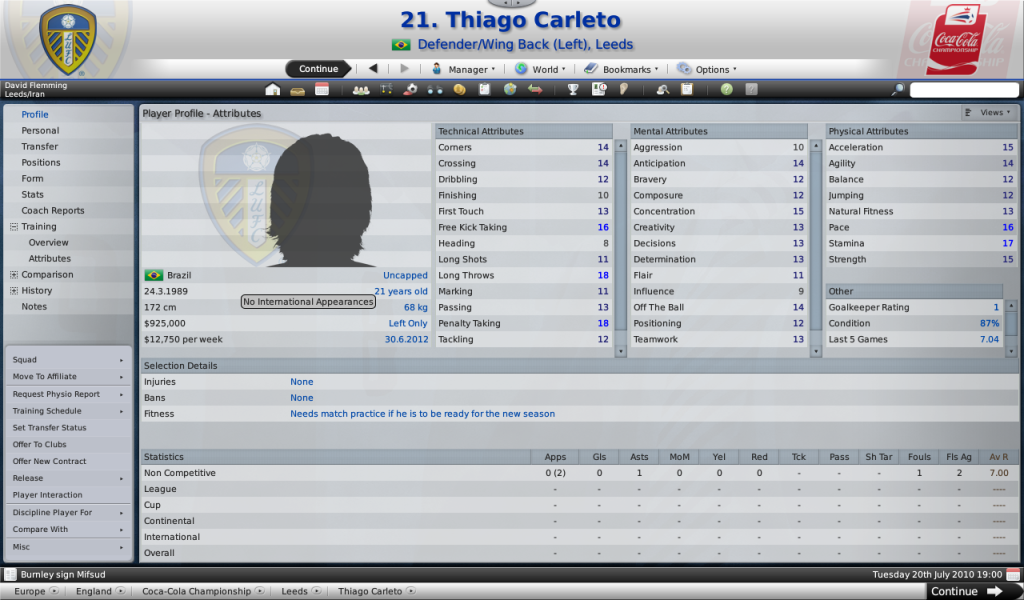 Fredsta wrote:I dont know, his most recent injury was either freak an accident in training or due to the massive workload I set him. I mean he hasnt played a full 90 for me all season so only played CM for about 45 minutes a match usually He sometimes plays well in CM, but only when there is space. Signed 13 players at Plymouth for a combined total of 250k. :lol: Had sales worth 3.5mil, but the board has taken almost all of it. Lame. Have a good squad. Only names people would know that I have signed are Jason Roberts, Carlos Edwards, Neil Alexander and Dylan Macallister :lol: