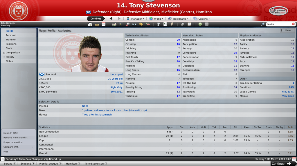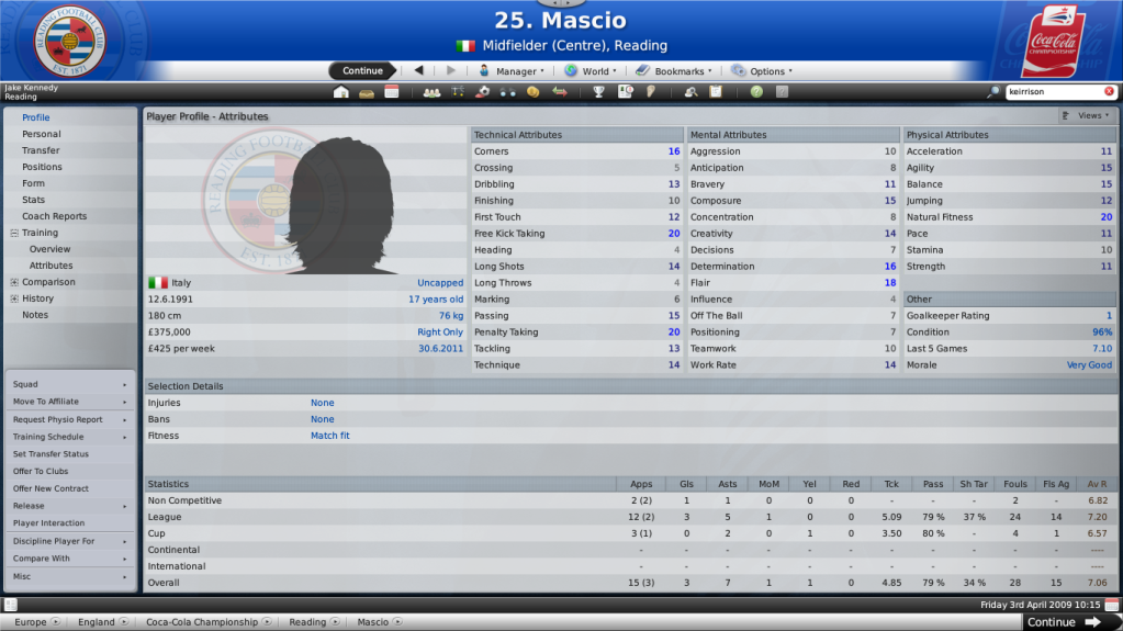 Yeah Mascio my young CM has simmilar stats but not that good and he has been a success, I searched for people with a fk stat of 20 in a hope of finding a gem in the lower leagues like I did Mascio so hopefully this guy turns out alright EDIT here is Mascio Edited by fredsta: 16/9/2009 08:11:21 PM