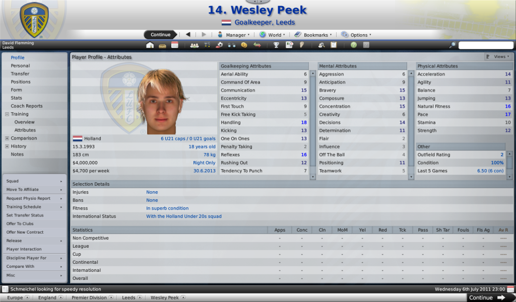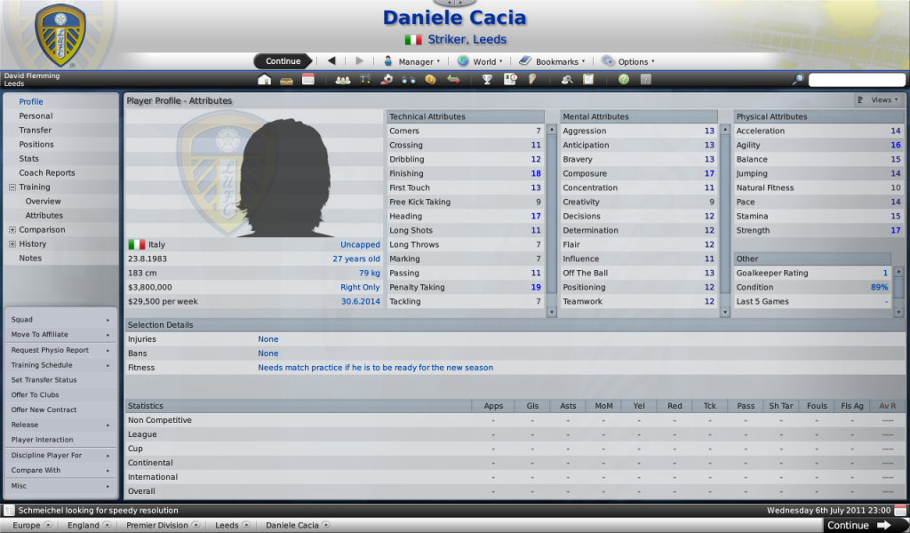 Fucking Laurito. He played half a season under me last season and Manchester United came knocking and he went to them. He got shitty cause I rejected their enquiry then they came in with $100M (AUS) offer which was good anyway, albeit 70mil of it is over 1 or 2 years. I bought an arguably better replacement anyways. For 35mil. A regen who has stats suited to a great target, what I need to suit my wide play. Get balls into him and he will score them: Dribbling- 16 First Touch - 17 Finishing - 16 Heading - 17 Jumping - 19 Strength - 19 Off the ball - 17 Anticipation - 16