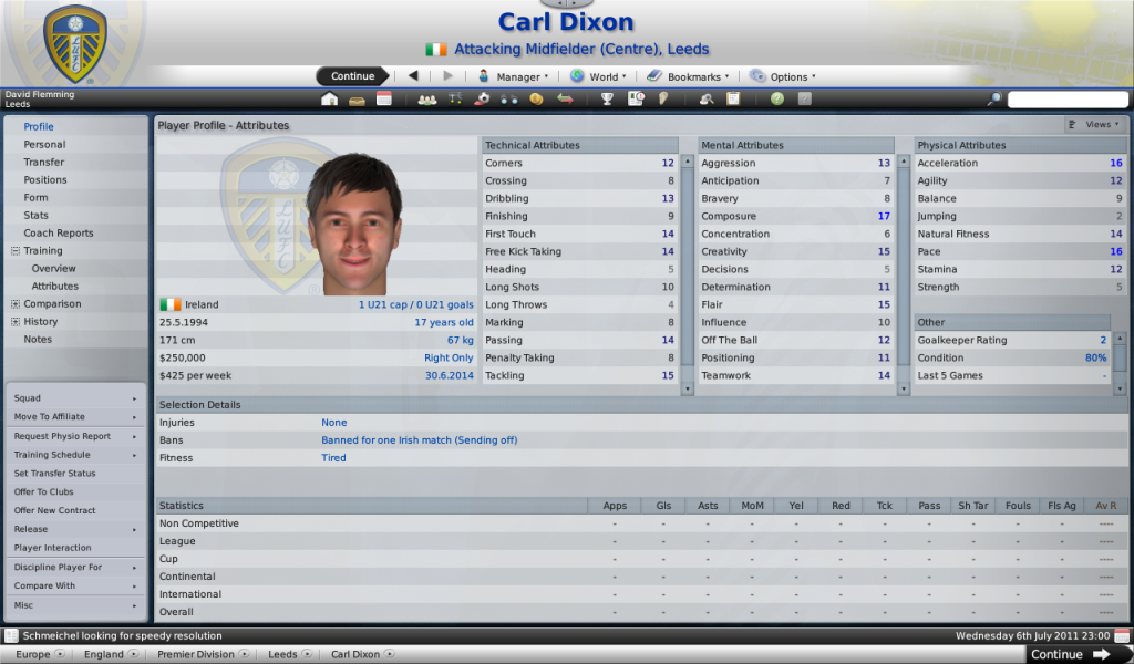 Great players for that level imno. Got back from the GC last night and have been playing FM for hours since. Won the CCC by a huge margin had it wrapped up ages ago though and went the season undefeated. I won MOTY only dropping MOTM twice and Doyle wins POTY. The following players joined in July-Saivet, Gignac and Laurito. The following players have been signed since- Marek Jankulovski from Milan for 100k Fleck from Rangers for 2.3mil A 17 y.o Italian kid at Inter who I have been scouting for ages called Luca Tremolada for 1.8mil he plays both wings and has pretty good stats for his age Another young Italian kid this time from the Celtic reserves, has some good stats so I signed him for 20k and will loan him till he gets better and use him as first team cover or transfer bait, Nene from Monaco on a season loan can play both wings Ever Banega from Real Madrid for only 2mil. Lining up like this atm --------------Hahneman----------------- --Santon---Balde----Yezerskiy-Jankulovski -Saivet--Zucculini---Banega--Nene/Fleck ----------Laurito----Doyle/Gignac------- I have a selection headache for the forward line atm though as Laurito has 2 goals in 2 games of the EPL, Gignac has 1 goal and one assist in one game while Doyle has two assists. Originaly I was lining up with Doyle and Gignac starting and bringing Laurito on as a super sub but he has scored in every game so far including pre season so I feel he has earnt a starting spot and Gignac is injured atm but should be back within weeks and has been prolific pre season but Doyle scored 30 goals and got 17 assists last season and has been scoring and assisting thus far. I think I will definitely have to improve my defence when I get the funds to do it as although Balde and Yezerskiy are quality they are ageing as is Jankulovski and Hahneman will have to replaced seasons end imo, attributes wise Federici is better but Hahneman performs extremely well, has an average rating of 8.22 this seaosn and had it at 7.9 last season First two games of the EPl season were a 2-1 win over West Brom, gaols to Gignac and Laurito And a 1-1 draw with Aston Villa goal to Lurito