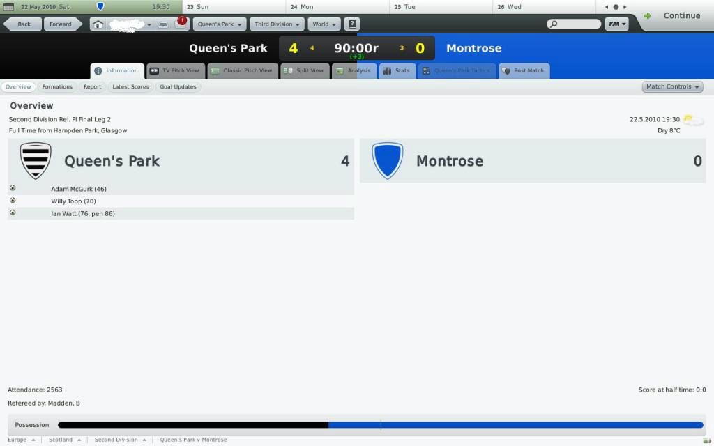 I decided to pick up my old game from FM 09 with Queens Park in the Scottish 3rd division. The team has the potential for a fun game. They play at Hampton Park in Glasgow which is about 52,000 capacity yet averaged only 600 in my game :lol: Anyway i was struggling big time and went as low as 8th in a 10 team league. Got 2 good loanees and signed a couple of good players and went on a amazing end of season run of winning the last 9 out of 10 matches. The top side gets automatically promoted while 2nd to 4th do a play-off which also involves second last of the second division. I got to the final of the play off and thought i had a good chance to get promoted. I lost the first leg 3-0 away and thought im fucked, the one bad game i had in ages and i get thumped. In the second leg at home it was 0-0 at HT and i thought i was a goner. Did the talk "we must get a result here no excuses" and this is what happened.  :cool: C'mon you spiders! Now for division 2
