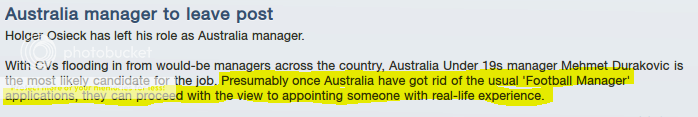 sydneycroatia58 wrote::lol: at the highlighted part. First time I've ever noticed that  Not nearly as embarrassing as Osiek being sacked for losing 3-0 to Thailand, then being replaced by Ian Ferguson, as is what happened with my save. :lol: