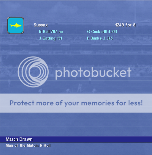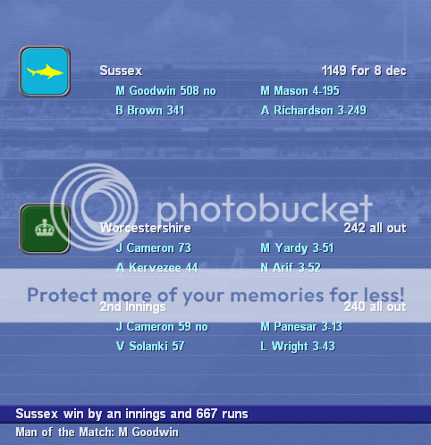 It's the closest thing to a cricket FM and I don't mind that it's very basic, it's still very addictive for me. If we're talking about greatest moments in ICC just see a few pages back in WFMB. Murray Goodwin is a gun. In that same save I've got a really good youngster I discovered at Sussex and is only 20 and already a regular for my England team. He's averaging 98 in first class matches this year and has just scored a triple century albeit against Duhram University.